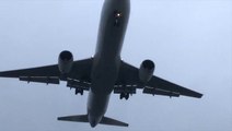 Plane emerges from low clouds on approach to New York