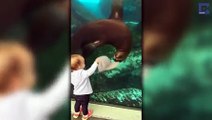 A baby got along with a seal at an aquarium