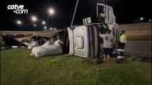 Motorista fica ferido após caminhão com 38 toneladas de farinha tombar no Trevo Cataratas