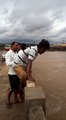 Boys jump from a tall bridge.....