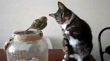 Знакомство кошки с воробьем.