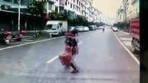 Woman crossing road narrowly escapes being run over by lorry