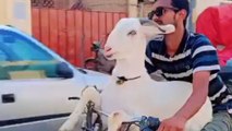 Goat sits comfy on a bike and enjoys every second of the ride