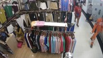 CCTV filmed the monk named Theeraphap Worradilok, 49, sneakily slipping six pairs of underwear that had been hung out to dry into his blue shoulder bag before scurrying away.