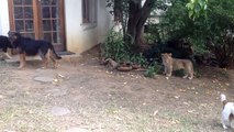 Sneaking Lion Cub Gives Dog Fright