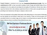 Trutech Products is one of the best transformer manufactures in India offer Control, Step Down , Isolation, Three Phase , Rectifier & Auto Transformer etc. methodically checked on different quality stages under the observation of our excellence officer. Click us;-http://www.trutech.co.in/