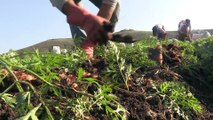- Havucun tarladan hasat edilmesi - Tarım işçilerinin tarlada çalışması ve dinlenmesi - Havucun fabrikada yıkanması ve temizlenmesi - Üretici Hıdır Ezer'in açıklaması - Suriyeli işçi Semir İlevi'nin röporatı - Cibran Cerellah'ın konuşması - Havucun ayıklanması ve paketlenmesiTarladan sofraya havucun meşakkatli yolculuğu - Hatay 'ın Reyhanlı ilçesinde hasat sezonunun başlamasıyla Türk ve Suriyeli işçiler tarafından çamurlu tarlalardan toplanan havuçlar, sofraları renklendiriyor - İlçe Gıda, Tarım ve Hayvancılık Müdürü Öcal: "Yaklaşık 6 bin ton havuç mahsulünü iç ve dış piyasaya göndermiş olacağız. Gelecek yıl Reyhanlı'da 5 bin dekar alanda havuç ekmeyi hedefliyoruz" - Üretici Ezer: "Tarladan birinci sınıf kalitede aldıkları havuçlarımız iç ve dış piyasaya gönderiliyor"HATAY (AA) - CEM GENCO - Hatay 'ın Reyhanlı ilçesinde hasat sezonunun başlamasıyla Türk ve Suriyeli işçiler tarafından çamurlu tarlalardan toplanan havuçlar, binbir emekle sofralara ulaştırılıyor.Reyhanlı ilçesinde sabahın erken saatlerinde Türk ve Suriyeli işçilerin havuç toplama mesaileri başlıyor. Çamurlu tarladan elle toplanan havuçlar, sapları kopartılarak çuvallara dolduruluyor.Traktöre yüklenerek temizlenmek üzere fabrikaya gönderilen üzeri çamur kaplı havuçlar, tazyikli su yardımıyla yıkanıyor.Fabrikalarda temizlenen havuçlar, erkek ve kadın işçilerce paketlenerek yurt içinin yanı sıra başta Suriye, Irak ve Rusya olmak üzere birçok ülkeye gönderiliyor. - "5 bin dekar havuç ekmeyi hedefliyoruz"Reyhanlı Gıda, Tarım ve Hayvancılık Müdürü Murat Öcal, AA muhabirine yaptığı açıklamada, havuç üretiminin kentte sürekli arttığını söyledi.