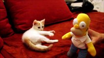 Cute baby cat play with Homer Simpson