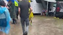 Auntie Mabel and Pippin fly home from a sunny day out to find it pouring with rain. As she unloads the plane, Auntie Mabel falls in a puddle, just like ‘Doctor Foster’. She is glad she fixed new guttering to her house, until a piece falls off and she has to repair it. Auntie Mabel sings ‘Incy Wincy Spider’ and tells the story of ‘Tiddalick the Frog’ while Pippin enjoys herself running about in the rain.