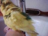 Wellensittich duscht sich im Waschbecken