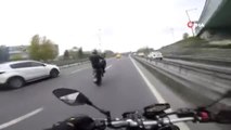 İstanbul’un çeşitli noktalarında akan tek teker üstünde giderek trafikte terör estiren magandalara bir yenisi daha eklendi. E-5 Karayolu Göztepe mevkii Ankara istikametinde arkadaşlarıyla seyir halinde olan motosikletli genç, trafikte akan araçların arasında bir anda tek tekerlek üzerinde gitmeye başladı. Bu şekilde metrelerce giden genç, motosikletin üstünde ayağa kalkarak tehlikeli şovunu saniyelerce sürdürmek istedi. Ancak seyir halindeyken bir anda dengesini kaybeden motosikletli, yere düşerek metrelerce sürüklendi. Kaza sonucu bir kenara savrulan genç ayağa kalkarak motosikletine koşmaya başladı. Arkadaşlarının uyarılarına aldırış etmeyen genç, motosikletini yerden kaldırdı. Hafif sıyrıklarla atlatan gencin kaza anı ise kask kamerasına saniye saniye yansıdı.