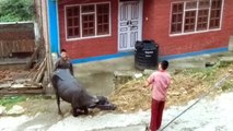 The buffalo is refusing to follow him