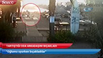 Marmaris'te otelde çalışan genç, şezlongda uyuduğu esnada tartıştığı mesai arkadaşı tarafından bıçaklandı. Muğla'nın Marmaris ilçesinde bir otelde çalışanlar arasında çıkan kavga kanlı bitti. Kavganın ardından Mustafa D., şezlongda uyuyan mesai arkadaşını bıçakladı. Bıçaklama anı güvenlik kameralarına yansıdı.Olay, Muğla'nın Marmaris ilçesi İçmeler Mahallesinde bir otelde gerçekleşti. İddiaya göre, otel çalışanı Arif O., iki arkadaşı ile birlikte sahilde şakalaşırken aralarında tartışma çıktı. Tartışma da kavgaya dönüştü. Ardından kavgada darp edildiği iddia edilen diğer otel çalışanı Mustafa D., arkadaşı Arif O.,'yu sabah şezlongda uyuduğu sırada bıçakla 6 yerinden yaraladı. Yaralı otel çalışanı ambulans ile hastaneye kaldırılarak tedavi altına alındı. Polis Mustafa D.'yi olayın ardından gözaltına aldı. Emniyet Müdürlüğü'ndeki işlemleri tamamlanan şüpheli adliyeye sevk edildi. Bıçaklama anı ise güvenlik kameralarına saniye saniye yansıdı. Haber