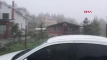 İlçe merkezinde gece saatlerinde etkili olan yağışın ardından çatılar ile araçların üzeri beyaz örtüyle kaplandı.