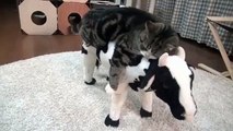 Un lindo gatito más feliz que un ocho... duerme a pata suelta sobre una vaquita de juguete