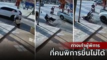 หนุ่มพิการนั่งวีลแชร์ พยายามขึ้นทางเท้า เสียหลักล้มหงาย หวิดถูกรถทับ