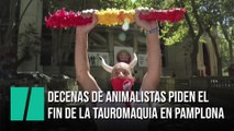 Unos 90 activistas en defensa de los derechos de los animales, semidesnudos y con el cuerpo pintado, han formado hoy en la Plaza del Ayuntamiento de Pamplona la figura de un toro muerto con el objetivo de representar la agonía y el sufrimiento de estos animales en los actos taurinos.
