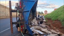 Caçamba de caminhão carregado com bobinas permanece tombada no Trevo Cataratas, em Cascavel