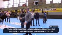 Feijóo hace un alto en la campaña para demostrar sus dotes con el balonmano que practicó en el colegio