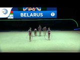 The junior group of Spain performs their 5 hoops routine during qualifications: 21.400 (D 13.7). Qualified to the apparatus final in 6th place.