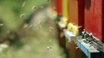 CloseUp of Flying Bees Entering the Hive