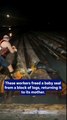These workers freed a baby seal from a block of logs, returning it to its mother.