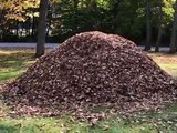 Dog jumping into a pile of leaves
