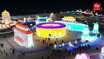 The drone footage shows impressive ice sculptures at the annual Ice and Snow Festival.