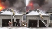 Un pompier fait du rodéo avec une lance incendie