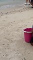 Il creuse un petit trou dans le sable et regardez ce qui en sort... Magnifique
