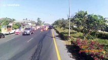 Then as Thanapob panicked and tried to regain control, he surged forwards and smashed into a row of four parked pick-up trucks.
