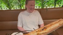 The clip, filmed in June 2019, shows Matthew picking up a cheese slice and flinging it across the table before landing the perfect bullseye.