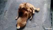 The yellow fur kitten mistook the yellow fur dog as its mother and the breast was suckled