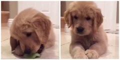Comme tous les bébés, ce chiot golden retriever a un peu de mal avec les légumes...