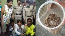 हरियाणा के फतेहाबाद जिले के टोहाना शहर की प्रभाकर कॉलोनी में एक बैंक कर्मी के घर पर सिलेंडर चेंज करने के लिए जब महिला रिफिल सिलेंडर घर के अंदर लेकर गई तो सिलेंडर के निचले हिस्से में करीब 3 फुट का एक सांप फंसा हुआ दिखाई दिया. सिलेंडर के निचले हिस्से में जैसे ही सांप दिखा पूरे घर में हड़कंप मच गया.