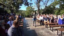 These two men played the role of flower girls at a wedding. They strutted down the aisle with their fanny packs, throwing flower petals to the beat of a song. They made quite an entrance and showed a few fun moves too, much to the amusement of the wedding guests.