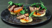 Menú de Navidad / Entrante: blinis de patata con Tataki de atún y vinagreta de aceituna