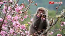 武陵農場台灣獼猴賣萌啃櫻花 遊客直呼「卡哇伊」(武陵農場提供)