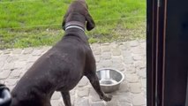 Dog with special needs cleverly bangs a bowl for food and extra attention