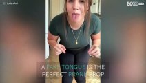 Girlfriend pranks boyfriend with fake tongue
