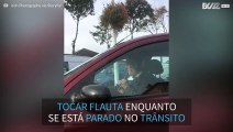 Homem toca flauta para aguentar stress do trânsito