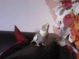 Voici nos perruches ondulées EAM Nany (jaune) et Chipy (blanche/bleue)