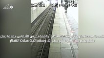 شاب متهور يقفز من رصيف محطة لآخر أمام قطار قادم.. شاهد ما حدث له!