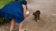 Man films wife's comical interaction with confused raccoons