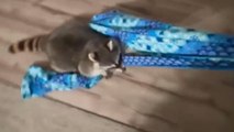 Playful raccoon jumps onto blanket for a fun ride and clings tightly