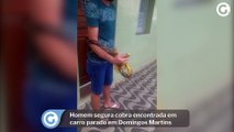 Homem segura cobra encontrada em carro parado em Domingos Martins