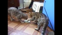 C'est la guerre entre 2 chats qui se disputent un bol de lait !