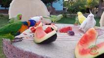 07.Indian Ringneck Parrot and Rainbow Lorikeet Eating Together