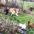 These two dogs, Mason and Tipi, were playing with their owner. The man threw the ball in the other direction for the dog to play chase. Mason, the dog, got very excited and jumped over Tipi and crashed into the rosemary bush while attempting to get the ball.