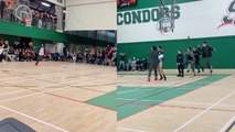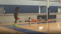 The youngling does a cartwheel, picks up the ball from the ground, and passes it to her dad, who then nails a stellar no-look shot.